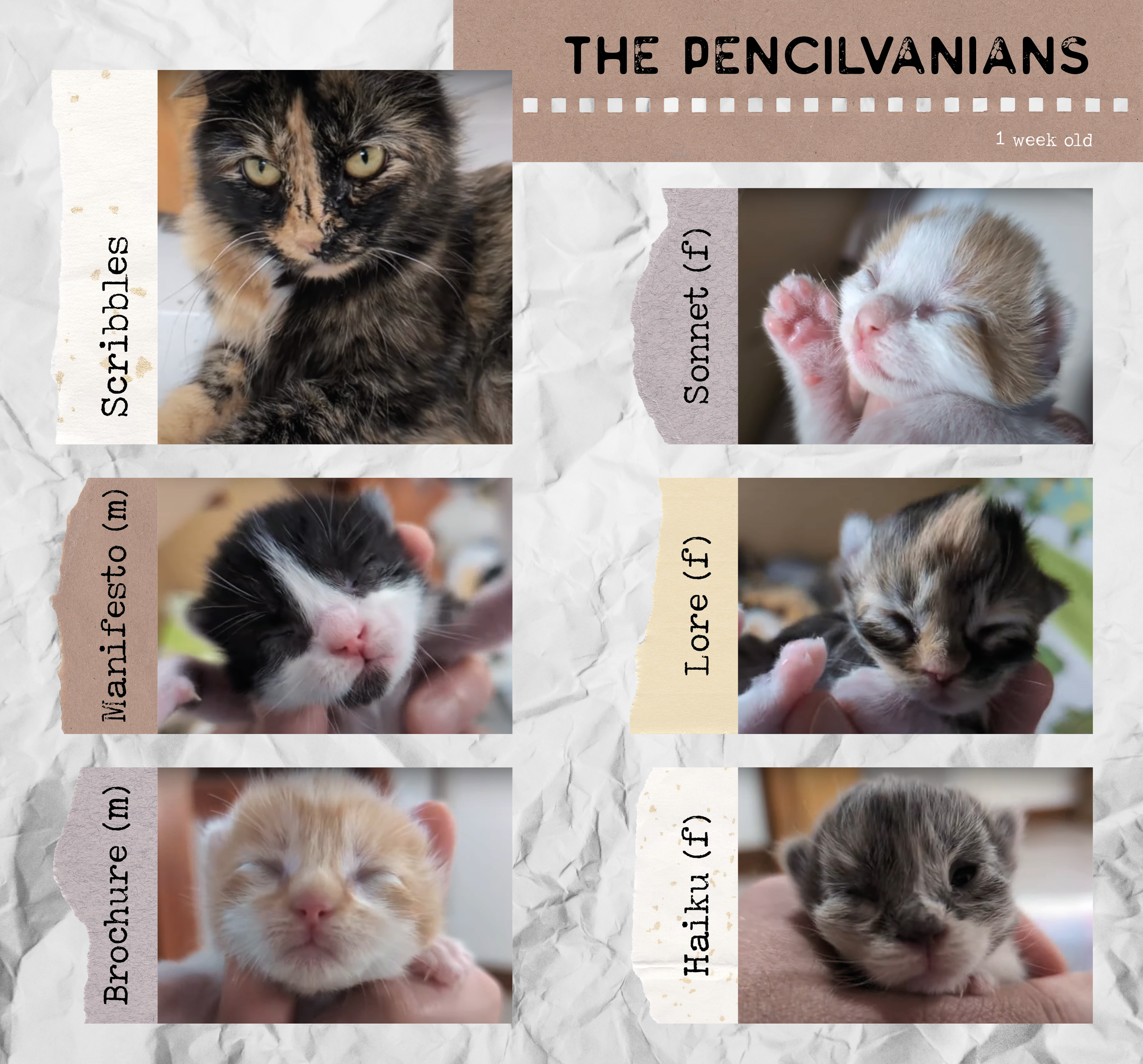 Three days after her arrival, Scribbles went into labor and did a great job. Five beautiful, healthy, uniquely colored kittens were born in the span of about 2 hours. A little over one day later, DJ had their names!